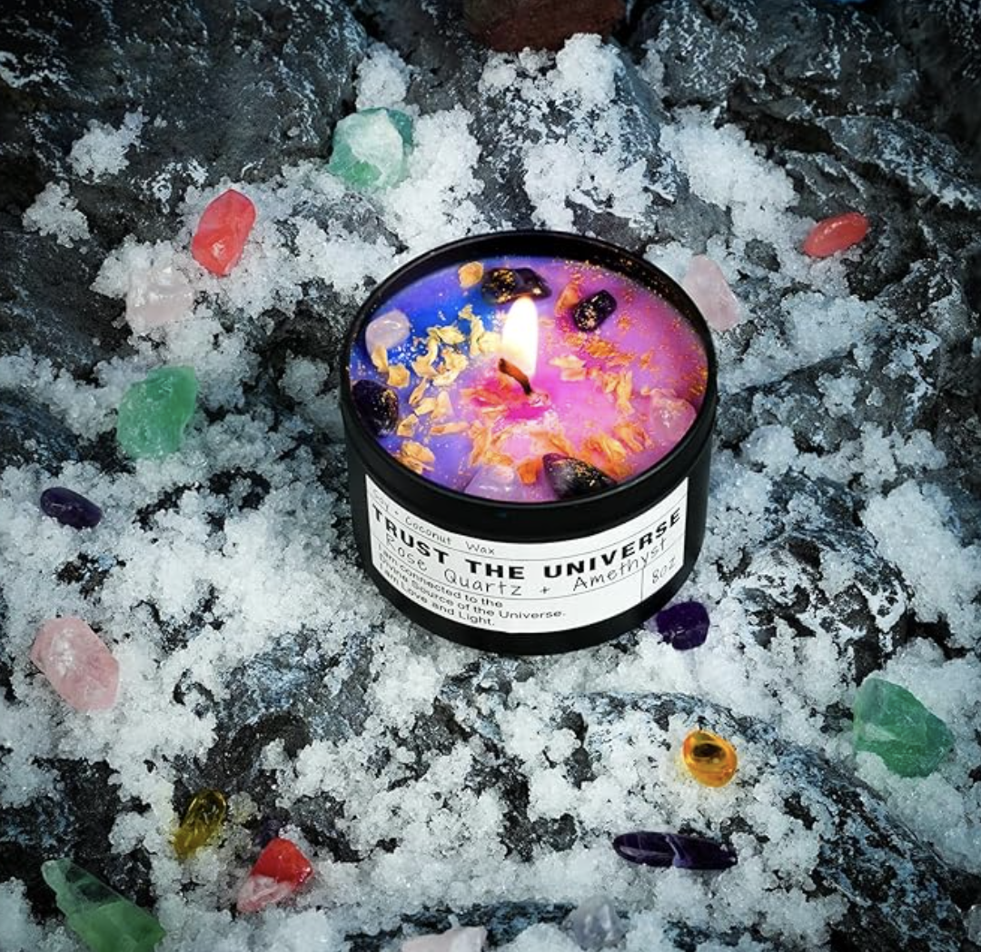 8 oz jar with vegan soy and coconut wax, crystals cleansed with sacred wood, & natural dried flowers.